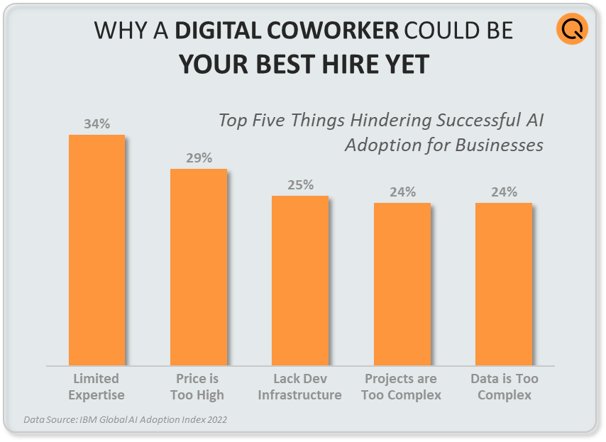 In this era of data abundance, leveraging diverse and extensive data sources has become imperative for enhancing operational efficiency and uncovering opportunities for automation and optimization. However, according to IBM’s Global AI Adoption Index – limited expertise, excessive costs, the lack of development ecosystems and tools as well as data or use cases which are too complex for today’s AI models are the top reasons hindering business adoption. With their light-touch integration, limited to no infrastructure requirements, conversational interfaces, and sophisticated machine learning capabilities, AI digital coworkers effectively bridge the gap between business and market capability and delivering operational efficiency. They effortlessly navigate through complex and unstructured data sources, leveraging scalable infrastructure to deliver actionable insights in real-time.